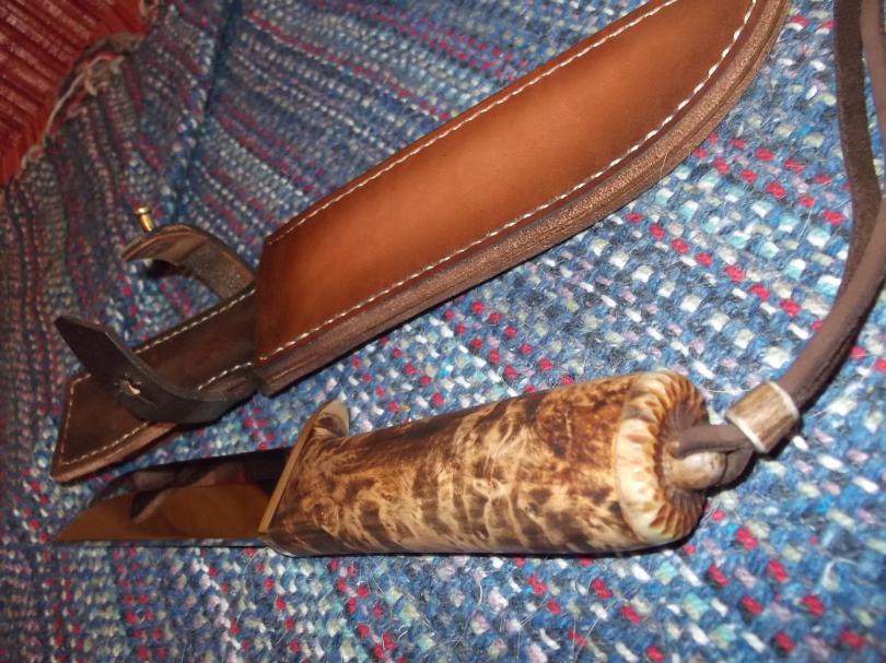 Ножны сшиты вручную (кожа-"фанера"), рукоять-березовый кап,гарда-латунь,тыльник-рог лося,темляк.Заточка-бритва.Нож разработан,изготовлен и собран Романом Серковым ("мастерская Романа Серкова" г.Самара).Малый клинок пока стадии дизайнерской разработки.