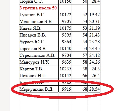 И еще раз! Обратите внимание, что все занятые места соответствуют возрасту участников! В протоколе в колонке "возраст" все цифры идут четко по возрастающей, как при сортировке. Так не может быть!!! Т.е., я в своей группе по возрасту был предпоследний и в протоколе у меня предпоследний результат с немыслимым временем!!! А те, кого я обогнал на дистанции (стрелял без промахов) впереди меня на несколько позиций с лучшим временем. А обогнал я двух и третьего почти достал на финише.