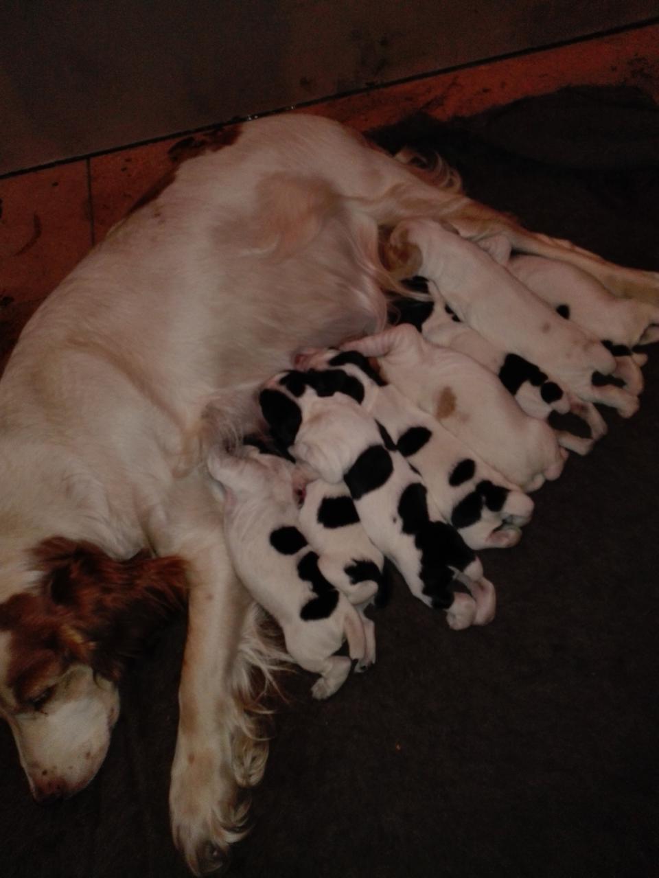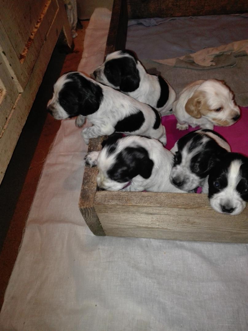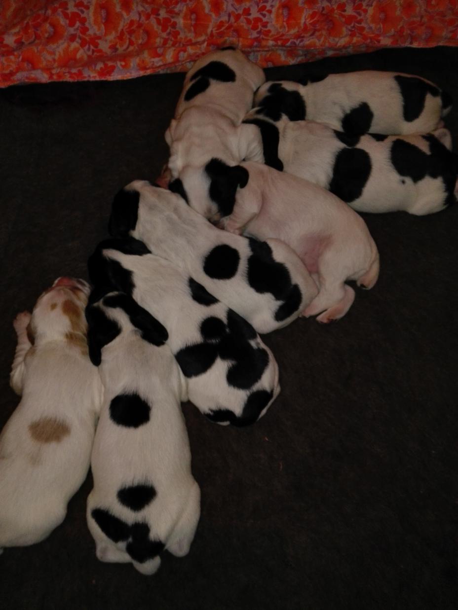 осталось 3 щенка: 2 черно-белых суки и бело-рыжий кобелек.