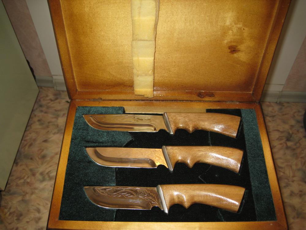 Старый охотник,ранее работавший начальником ИК,попросил разместить это объявление.Продается новый подарочный набор ножей.Коробка деревянная резная,размер клинков ножей снизу вверх 12см,13.5см,15см.Гравировки в одном стиле,но не повторяются.Набор изготовлен в одном экземпляре к ДР,полностью ручная работа.Достойный подарок товарищу и себе любимому.Цена за набор 7 т.р.Но,ранее уже был задан вопрос о возможности разбить набор.Можно,цена любого ножа 2.5 т.р. т.8902375ноль091