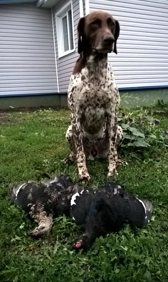 Сегодня целенаправленно решили съездить с собакой на старое место, поискать выводки тетеревов.Приехали,прошли 0,5 км и тут пса всего заколбасило,начал делать потяжки.Через некоторое время наконец замер в стойке.По его поведению сразу стало понятно,что он нашел наброды тетеревов,или в крайнем случае куропаток. Но никак это не перепела или коростели.Метрах в 10 от собаки и метрах в 30 от меня с шумом взлетает старый,ещё не полностью перелинявший петух.Стреляю из правого ствола дробью № 5 - готов.Идём дальше,пес снова потянул, потом стал.Подхожу, взлетает стая тетерок.Но кур мы не стреляем-идём дальше.Опять пес потянул и неспешно шел так метров 100 пока не замер в стойке.Взлетает стайка чернышей,но уже на самом пределе уверенного выстрела.Стреляю в ближайшего-подранок, летят перья. Стреляю в него же с другого ствола-падает и сразу удирает в густую траву.Пёс догоняет,несёт добычу мне.Молодой,не перелинявший петушок с выводка этого года.Значит выводки уже распались и искать их бесполезно-куры стали жить отдельно.Петушки объединились в группы.Через некоторое время тетерева совсем перестанут держать стойку собаки и начнут влетать за пределами выстрела.Что-то рановато в этом году.А пес устал - набегался от души+эмоции от процесса охоты.