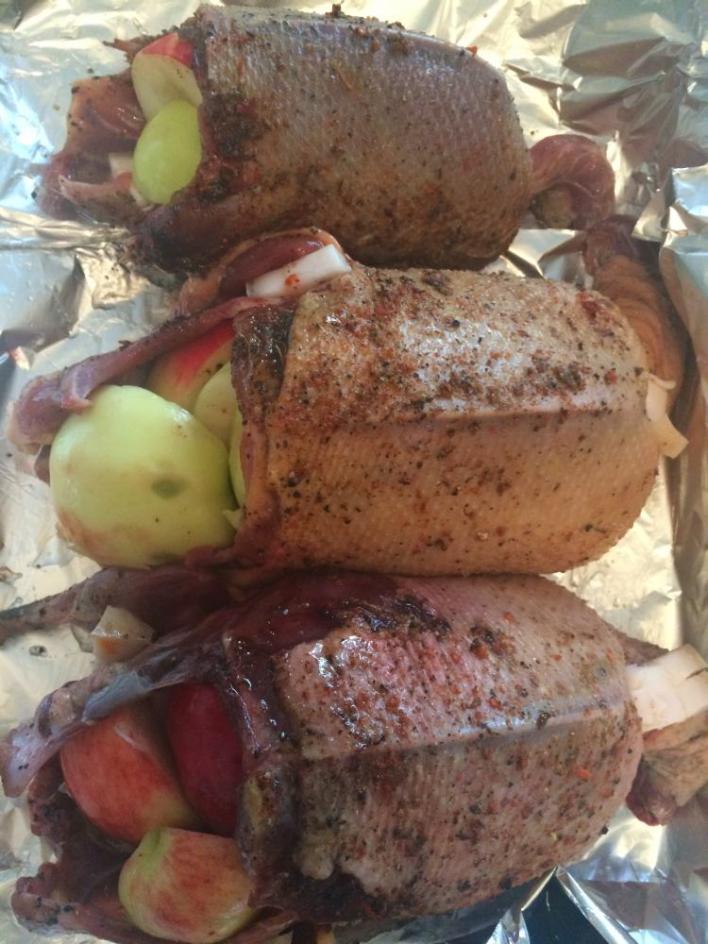 "Утка с яблоками под апельсиновым сиропом". Подготовленная тушка (очищенная, промытая, кожа сохранена при ощиповании)замаринована в соли и перце на 12 часов. Шпигуем салом без фанатизма, хоть утки очень тощие. Внутрь уток ложим сальцо кусочек и яблоки ( с дачи, красные, не было других))) Завернул тушки в фольгу и в духовку на 1,5 часа при 170 градусах. Пока тушка запекается, нарезаем шкуру 1 апельсина ломтиками, сок апельсина выдавливаем в сковороду и нарезанную шкурку туда же, добавляем туда же сахара две столовые ложки, кипятим пока не выпарится почти вся вода - получаем сиропчик. Достаем тушку из духовки, поливаем сиропом (его по объему остается как раз обмазать тушки), корки аккуратно раскладываем поверх на тушку. Ставим все в духовку на 15 минут открыто. 10 минут и все было съедено семейством, даже кто дичь не воспринимал... ))) Рецепт с Ганзы.