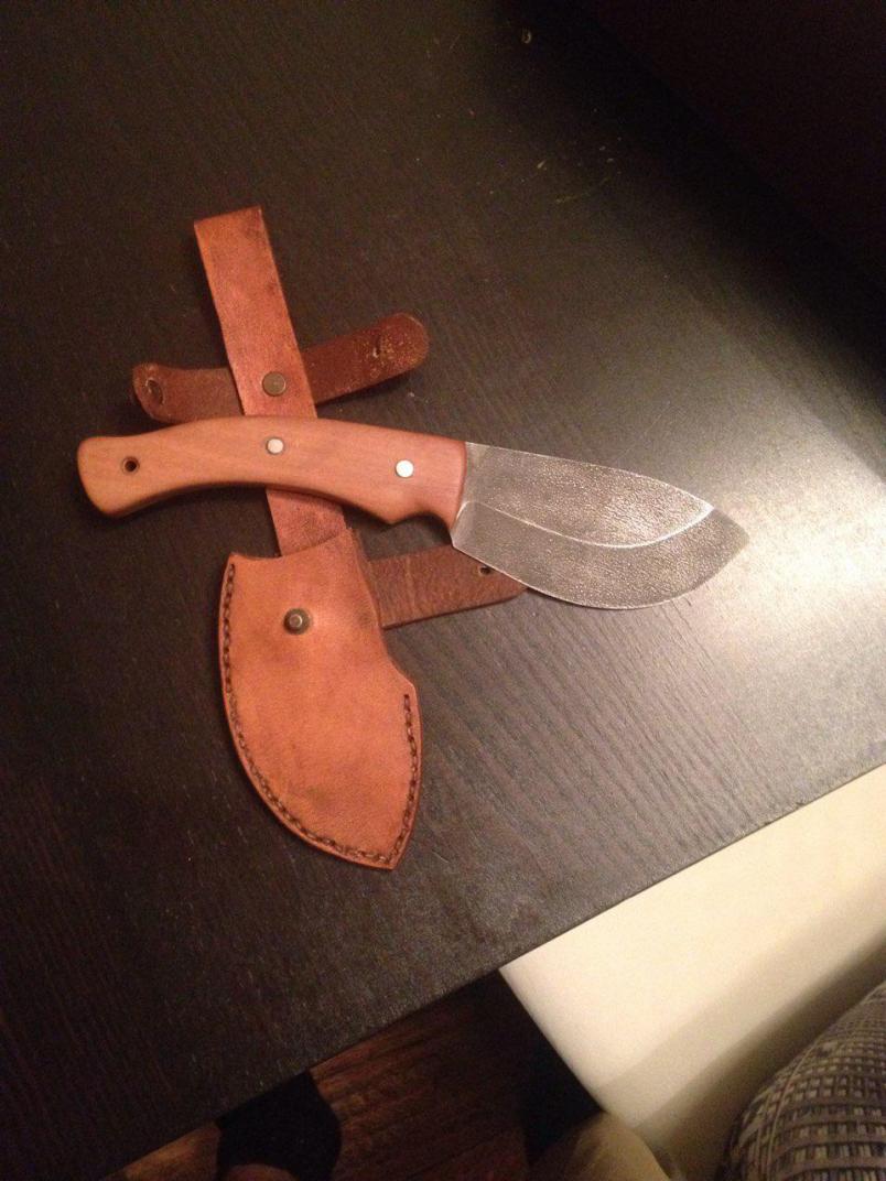 Скинер вот такой сваял: сталь алмазка (ХВ 5), форму вычертил сам, клинок изготовил Саша Бессонов из Нижнего. Рукоять по моему ясень. ножны тоже сам.