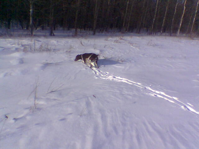 В прошедшую пятницу 2 часа гонялся за зайцем по джунглям из осоки. След из поля привёл меня к озеру. Скидка была прямо в заросли. Поднялся он от меня в 5-7 метрах, но я его не вижу а только слышу как тростник хрустит. Спрыгиваю с лыж и за ушастым в дебри. Пробираться сложно ,но и заю не легко , он не скачет а ползёт. На открытое место вылезет и метров через 100-150 опять в джунгли. Намотали так мы с ним км3-4 и я сдался. Я этого кустодрота так даже и не увидел воочию, хотя был впереди меня все время не далеко. Умотал он меня так ,что до машины я еле доплёлся. Сегодня решил его навестить. Из дома выехал в 7-45. Погодка чудная. Но в 8-00 снег как будто включили. Следы все позасыпало.Зайчика я не нашёл, зато увидел два ночных следа от хрюнов. Судя по копытам -не мелкие. Как то очково стало лазить по этим местам с 1 в стволе, да и снег валит . Решил возвращаться домой. В следущий раз зайца навещу.