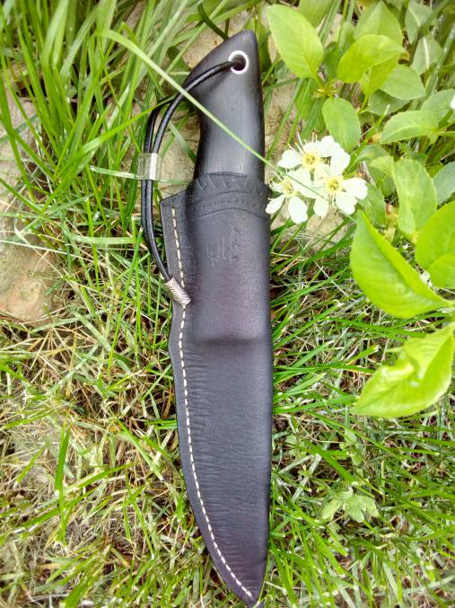 Отверстие для темляка. Спуски прямые не от обуха,фальш лезвие сведение 0, 2 мм. Больстер латунь, с внутренней стороны битый камень. Слесарка моя. Монтаж всадной. Ножны свободный подвес, натуральная кожа. Твердость по Роквеллу 59 ЕД. 3500 руб.