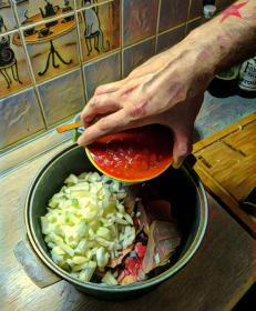 Что понадобно? Язык от одной коровы (быка), хоть и лосиный. Банку перетёртых помидорий, я в Ашане беру, итальянские. Лука репчатого - с полкило. Мелко порезать. Приправы. Тут придётся напрячься: паприка (в моём случае - копчёная), зёрна горчицы, горошковые перции, зира-кориандр (совсем шушуть), чабер, молотый перец. А впрочем, кладите что вам нравится! Чо я, в самом деле.. Вместо солёных лимонов я, не знаю почему, решил, что подойдут каперсы. Ну, где я, в самом деле, найду солёные лимоны в Самаре? Растительное масло. У меня нашлось оливочное, его и булькнул. Кунжутная паста. Звучит страшно, делается за пять минут. Покупаете обычный кунжут, белый. Высыпаете на сухую сковороду. Постоянно помешивая прокаливаете минут.. пять, примерно. Когда он станет офигенно пахнуть и щёлкать - готово. А потом - просто растереть его в ступке. Теперь по рецептуре. Язык варить примерно час. Я в холодную воду положил. Потом обдрать от скорлупы и нарезать ломтями. Обдирается с трудом.. я, признаться, по-разному пробовал обдирать: и после холодной воды, и "на горячую", и уксусом обливал - один хрен - напляшешься. Поэтому - как хотите, так и обдирайте. Художественного творчества не стесняю 😉 Ломти уложить в каструль. Тудой докласть: лук, помидории, специи, кунжутную пасту и масло. Долить кипятком, по вкусу. Посолить. Каперсы добавить минут за десять до готовности. Когда готовность? Да чёрт его знает, я буду час тушить, а там поглядим. Сегодня пробовать не буду, хочу холодное отведать. Завтра расскажу, чо вышло. |