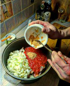 Приправы. Тут придётся напрячься: паприка (в моём случае - копчёная), зёрна горчицы, горошковые перции, зира-кориандр (совсем шушуть), чабер, молотый перец.