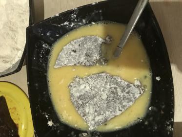 Печень наобещаем кусками, солим, перчим, обволакиваем в яице, затем в муке, затем в панировочных сухарях, жарим с каждой стройный по три минуты. Готовим соус: кефир, сметана, чеснок, солёный огурец |