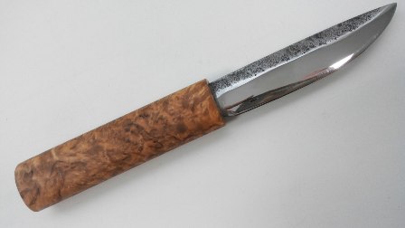 Ради интереса сделал якута из кованой У10А. Рукоять из карелки. Ножны - еловый кап. Ну да, углеродка режет. Геометрия для строгания стружки, сала и мороженой рыбы самая лучшая. Еще им можно сверлить доску... Но вот яблоки и морковку не айс. Да и удержание РК далеко от порошков.