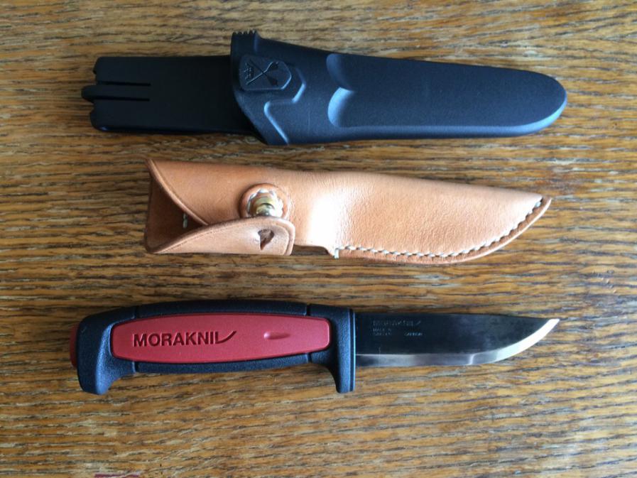 Продам два отличных ножа . 1) Нож "Pro C Mora Knife",сталь углеродистая,толщина клинка 2 мм.длинна 91мм,ширина 23мм,угол заточки заводской,23%.без микро подводов.Рукоятка нового образца из специальной TPE резины(шикарно и безопасно лежит даже в крупной ладони,удобней у моры не встречал),снимал таким шкуру(не этим),шикарно отработал. Твердость 56-58. заворонил оксидированием чтоб масло держал. Пробег минимальный,один поход(пара куриц,сало,хлеб),не рубил ,не строгал. Продаю в комплекте с двумя ножнами,пластиковые заводские,и из натуральной кожи,делал под заказ,отлично на поясе крепятся,и 100% фиксацию ножа обеспечивают в отличие от заводских ножен. Продается только в комплекте,ценник 1200р. (одни ножны только за 2р брал,подходят на многие модели моры.)