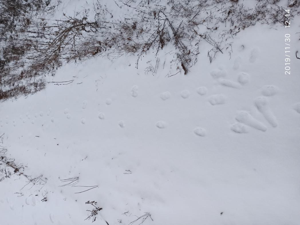 Я жалюсь, что пусто. Он говорит, что один след видел, на дороге. Предлагает вместе вытропить. Пошли, походили, след пропал в зелёнке. Ещё пошатались, больше ничего. Попробую завтра до снега ещё раз поискать, авось за ночь натопчут..