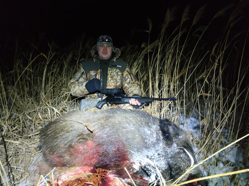 Шорох… Да нет, это ветер… Шорох… Бл..ь кабан наш ведь. Предохранитель выключил, теплик и не гасил…Не видно ни чего. Видимость с фонарем метров 5, с тепликом максимум 7. Медленно идет на меня, все – вижу… По инерции крутнул башкой влево в право, кабан дернулся влево, хвост дыбом, холка стоит, практически не раздумывая выстрелил… Затих!