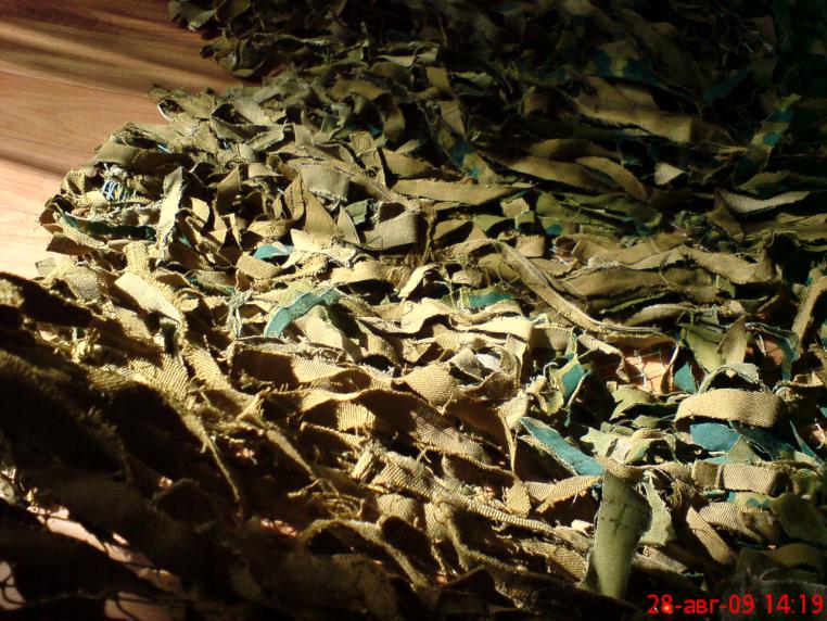 1.сетка ячея 1.5\1.5см полотно 2м на 4м 2 старые афганки\комки(с армии остались) 3 желанье афганку нарезал соломкой примерно ширина 3-5см и длина произвольно. в произвольном порядке на два узла привязывал. мне нравится. тока тяжеловатая. натуральный материал |