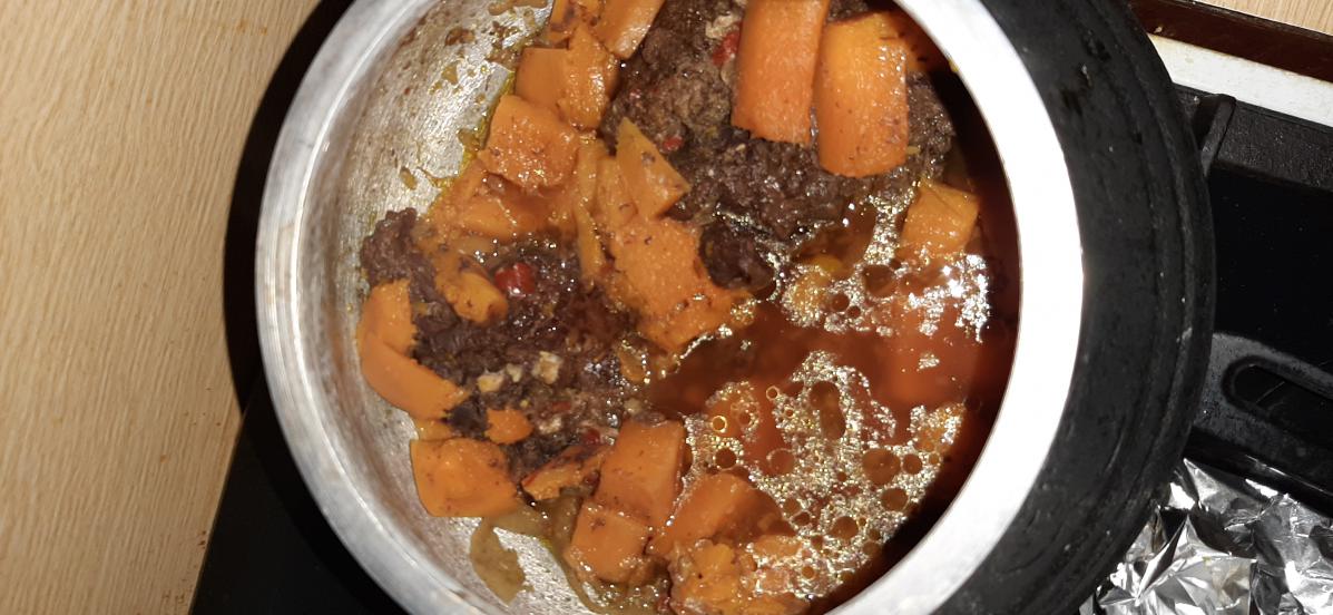 8 марта. Шея. Тыква. Афган казан. На дно покрошил пару луковиц, налил масла, соль, сверху уложил куски шеи. Посыпал кариандром, присолил, немного чеснока, чероого перца. Поверх всего уложил тыкву кубиками. Закрывать крышкой сразу не стал. Поставил на угли, лук зажарился, пошел хорактерный запах, мясо стало отдавать сок, залил стакан воды и закрыл крышкой. 40 минут и на стол. Девочки оценили!