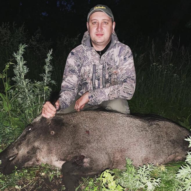 Кабан встрепенулся, замер на долю секунды и развернувшись кинулся обратно в лес… Каких то 30 метров… Выцеливая дальше увидел в прицел Ваню, на которого практически и бежал раненый кабан… Успел опомниться и не нажать на курок, тем самым спастись обоим нам от катастрофы… Ваня спокойным выстрелом добрал подраненного зверя выстрелом в лопатку…