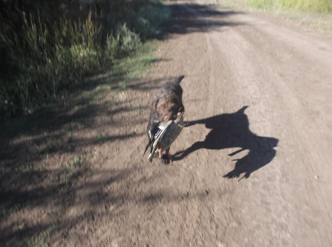Выехал сегодня в 8-00 прошвырнутся по знакомым лужам. Встретил охотника с сукой драдхаром. Поболтали немного. Он похвалился что добыл чирка. Мне хвалится пока было нечем. Ну решили - ТЫ на лево ,Я на право. Отъезжаю от него всего лишь метров на 300 , и вижу краем глаза через камыши утей. Машину к кустам , сам заряжаюсь и к болотине. Но поздно - утки спалили машину и уже летят на развороте не на выстреле штук 10. Охотник с псиной это тоже увидел и подъезжает ко мне. Начинаем обсуждать,как так про.....ли столько уток пока болтали . И тут я вижу , что на противоположном берегу болотины гуляет вдоль воды крякаш. Не улетел со всеми. Мужик кричит -Стреляй быстрее пока в камыш не убежал, это подранок чей то. Дистанция метров 35-40. Я сразу -БУМ . Крякин кувыркнулся но ползком шустро гребёт в кусты .Второй выстрел его успокоил. Мужик просит - Дай моей собачке поработать , ей всего 7 месяцев. Я естественно с радостью ( не лезть в болото)- Пожалуста. Дося (такая у неё прикольная кличка) в плавь на прямую не пошла , а оббежала по топкому берегу и найдя кряка , уже на прямую через воду принесла прямо в ноги. Правда по молодости ещё своей отдавать сразу дичь не хотела . За что получила кепкой от хозяина по ушам. А так молодец собачка. Вот правда позировать отказывалась , бегала с уткой вокруг нас и ни как не хотела стоять на месте. Ну поблагодарил я хозяина псинки и саму Досю за помощь и погнал домой.