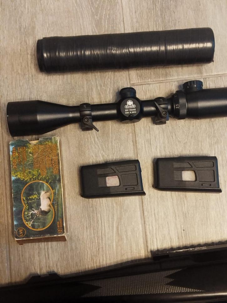 В продаже карабин настрел 200-220 только латунь прицел хако супер б на быстросемах стальные, банка с документами, два магазина на 3 патрона, ремень с быстросемными антапками.