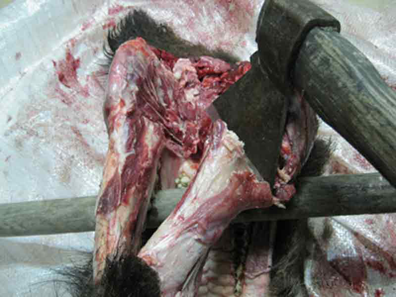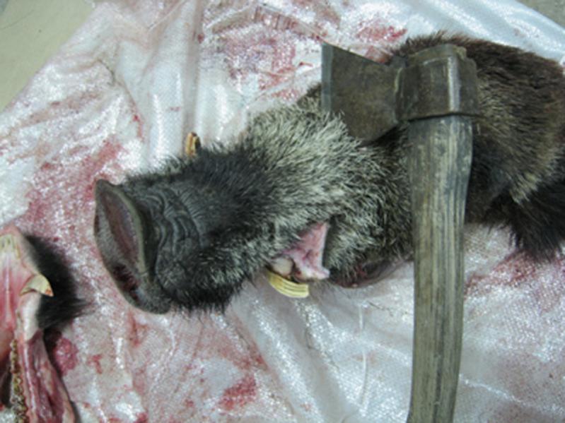 - Хочу порекомендовать начинающим охотникам "трофейщикам", как лучше !! Не буду говорить ((правильнее)) правильно у всех по разному, срубать клыки... -голову переворачиваем, извлекаем язык -вставляем палку между нижней и верхней челюстью, чтобы при рубке зубы не сломались друг о друга. -начинаем с нижних клыков, срубаем нижнюю челюсть, отделяем -подставляем что то, под верхнюю челюсть и рубим краем топора (верхняя часть - хрящ) -срезаем лишнюю мякоть. |