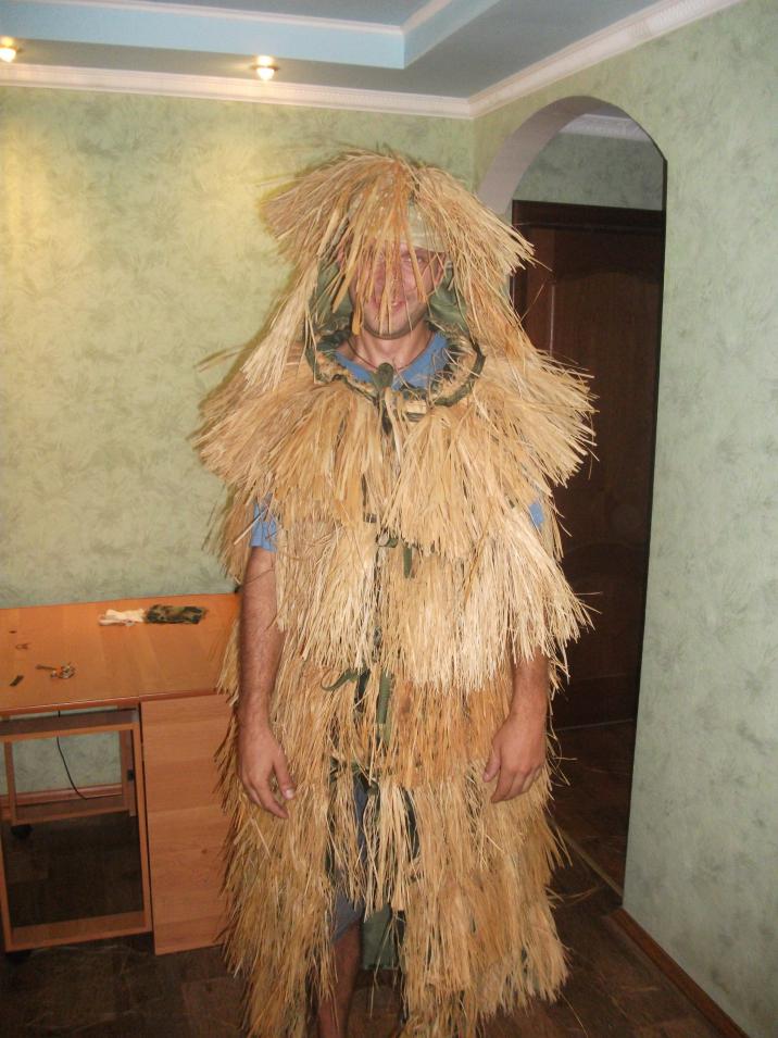 Вот так выглядили наши костюмы естественных условиях. Сильно не увешаны лыком поэтому даже в мокрых легко передвигаться. Опять же осенью когда камыш ещё зелёный, из одного лыка костюм будет выделяться.