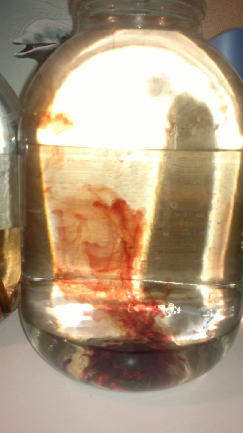 -после перегона сыплю марганцовки, стоит дня 2 выпадают хлопья 1 фото-добавил марганец 2 размешал 3-2 дня выпал осадок. и фильтрация через вату обернутую в бинт.становится чистым - по простому в домашних условия спирт с водой хорошо смешивать так вроде. часть спирта-часть воды. все это дело почти доводится до кипения и смешивается,хорошо встряхивается и на охлаждение(не комнатное)