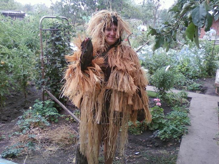 Вот так выглядили наши костюмы естественных условиях. Сильно не увешаны лыком поэтому даже в мокрых легко передвигаться. Опять же осенью когда камыш ещё зелёный, из одного лыка костюм будет выделяться.