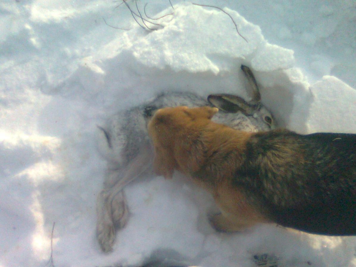Вот и мы седня проредили популяцию косых, я мой отец и Серега 269 (ну еще наша собака, которая стерла подушечку на лапе ) прогулялись седня на славу, заяц лежал в траве, что с мой рост. Сначала я начал тропить один след, вдруг сошлись два следа, но но потом на следе снегохода они разошлись в разные стороны я как правильный пошел на право пройдя с полкилометра тут след уходит вправо, я по следу метров десять и смотрю поднялся, а в траве то снега полно, бежит медленно вообщем с третьего я его взял. Фото не ахти ( какие уж есть).
