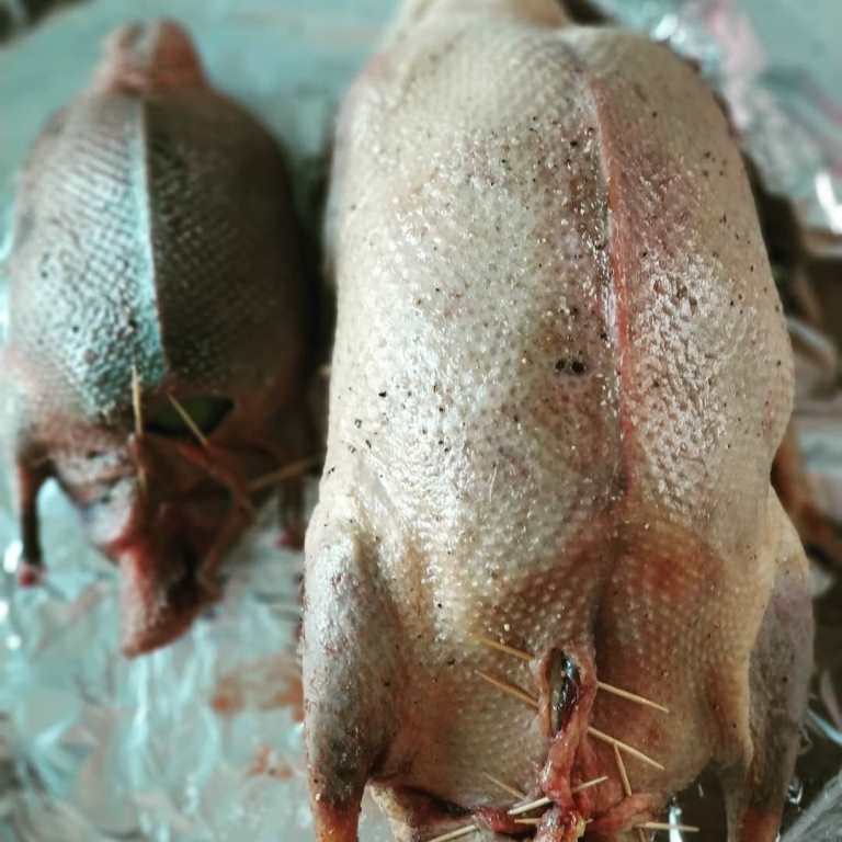 Один из гусей при добыче сильно "пострадал", пришлось снимать и шкуру и разделать его на куски. Попутно с трех гусей и одного селезня добавил потрошки (их отварил предварительно 20 мин.). Далее все это обжарил с луком и уложил в глиняный горшок еще на 1 час в духовку, специи только соль и перец, сухое вино белое. Далее можно добавить к любому гарниру, ум отъешь! Я так ем!)))