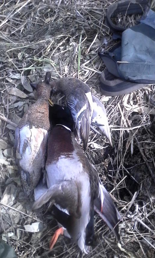 Утром выезжая из города в 3,30-на яме спустило колесо. Так начался наш путь в угодья. Быстро меняем, едем.На утрянку чуть опоздали.Пришли на место уже почти светло было.Быстренько чучела на воду , сами в скрадки. Посадил стайку свистунков на воду- далековато.Пара крякв долго кружили над лужей в итоге сели на другом конце.И ВСЕ. На этом утрянка кончилась.Утка моталась в основном вся по парам, если стайками то на кислороде.Перешли с товарищем в другой угол снежницы. бросили чучела и пошло. В общем охота удалась . В угодьях стреляли за утро 2 раза .ТИШИНА.Что не могло не радовать. Всех добычливых с полем.