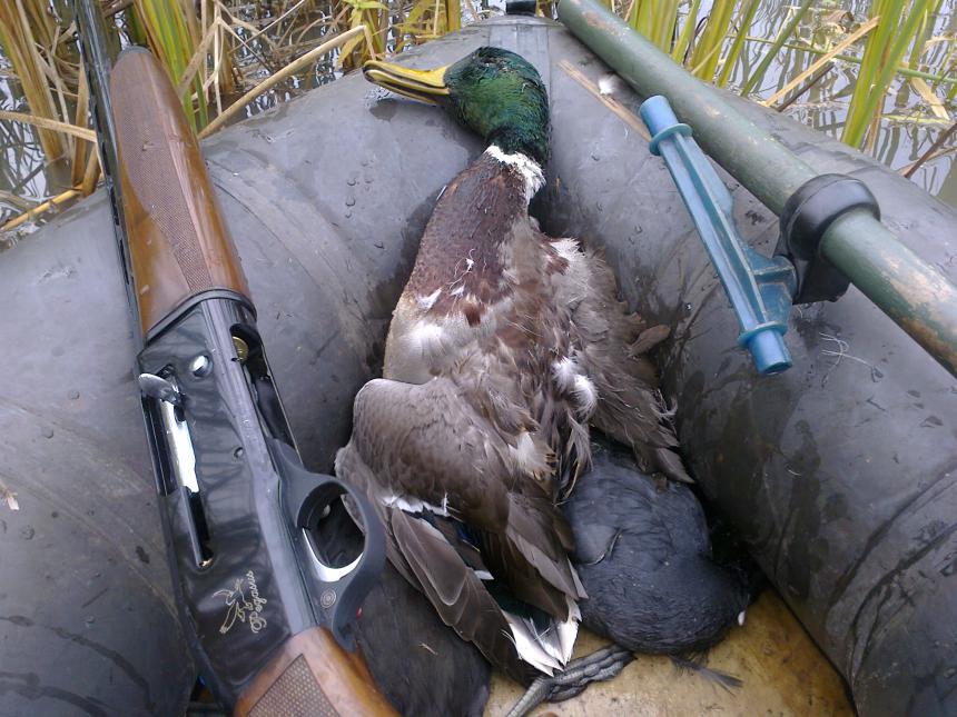Со вчерашнего собрался, загрузил моторку в ниву и в 8 утра в путь на водоём. Дорога как обычно... Нива с надписью на заднем стекле "ПРОДАЮ" неслась среди полей разметая желтую листву в разные стороны... продаю за 260 кстати))) Пасмурная осень, во всей красе! Провожала меня от лесной к лесной, сквозь зеленые озимые и пашню. Приехал на место, выгрузился.. и вот на, дождь... ну и ладно. собрал лодку довольна-токи быстро, уже приноровился.. И наконец-то звонок! Наш друг звонит Дядь-Коля (Проводник) Ты где бродяга? та я тут, лодку собрал... готов в море идти! Давай к нам на чай...ОК! Лечу. Завел мотор и к ним.. волна конечно... Дядь-Коля встретил как подобает... налил стопочку... но, я бы с радостью.. рулька блин... не любитель я за рулём. Они то в ночь... ну я чайком... и тут у них шулюм поспел... Ребяяяя..... Дядь-Коля Бог шулюма!!!! Я даже так и сказал: Жаль что я не с будуна!!! Тааакой наваристый... короче подкрепили, согрелись чайком и попрощались на этом.. Дядь-Коль привет!!!! Я рванул по волнам на остров, что в пяти км от берега " Крысиный остров" А по пути... утей... видима не видимо... разных... подошел к острову... сразу снялась стая Крякашей,волна сильная... я обошел остров, на тихом не сидят, а в волну опять сели... я постоял подумал... не Айс мне тут... рву я на большую землю, обратно. Подъехал к "своим" местам... утка.... одна за одной.... одна за одной... грешен... стрелял... но не подпускает с подъезда... волна.. не разгонишься.. тут бряхать не буду, иначе не люблю брехни. Но, оно и к лучшему знать, не особо честно... Шел на лодке вдоль камыша... как только поднял сильную стаю, голов 20-30 кряквы.. стоп! Разбросал чучалки и в камыш. Покрякал... мин 10 прошло как стал, налетают два селеха... бах! один лёг. Потом часа два тишины... Думаю, что-то не то! Залез глубже в камыш, чечел не видно, но после каждого позыва (игра манком) 5-10 мин и на лет на обманки... но! Не всегда вовремя... то-есть... 10 налетов (стай!) один шанс выстрелить... иначе мгновение! Раз... и все... Поохотился я так часа три... добыл двух уток... Вот они. другой ракурс.. Ну че? время уже 16,30.. надо бы рвать когти... пока лодку соберу... то-сё.. Собрал чучела... и в парус!!! по дороге поднял ещё 6 крякв... сука целил...))) врать не буду!!! но, далеко.))) да-ну азарт... поймите...уж.. Приехал, собрал кораблик, думаю а ведь и до вечёрки-то не далече... Мож к Дядь-Коле рвануть? Он вроде сказа, что место сменит... и сказал куда поедут.. а поеду ка я поищу, сними повечёрю... искал, искал... так и не нашел... А веть чувство было,что он останется на месте... но, не в этом суть... тут КАБАН ....)))) Короче поехал ка-я домой... ну её эту вечерку! Ну а чё? вроде не пустой... и устал маленько.. изматывает сборка лодки... Еду домой.. мимо поле скошенной кукурузы... и прям по середине оставили не скошенную межу кукурузы метра два. Дай думаю-ка я встану на вечерку на поле кукурузы, а мало-ли? летит на поле жрать... ну что? зря вечерке пропадать? Зарядился пятеркой и пошел вдоль -не скошенной межи, в центр поля. Постоял покрякал... 10 мин.....20 мин... тишина... та, думаю, херня всё это! Поехал я домой... и иду к машине обратным ходом.. иду себе... И сука приспичило мне пострелять.. Ну как-же? Мне-же починили мою пятизарядку!!! И поймал я на мушку здоровую кукурузину.. иии БАХ!!!!! она разлетелась эффектно! Я в другую БАХ!!! та-тоже.... я в третью БАХ!!! ИИИ тут храп бег... что-то летит на меня... я понял, что кабан... Я КАК ЗА ОРУ!!!! ААААА БЛЯЯЯть!!!))))))) А сам досылаю пятёрку... он