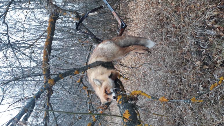 Желаю вышему питомцу скорейшего выздоровления. В понедельник ездили с товарищем в угодия, своего выжлеца не брал, по причине травмы от черного терьера на пргулке. Взяли молодого 10 месячного эстонца. Подняли лисовина в овражке, пока выжлец гонял козы шумовые носились как огалтелые. Сначала он выгнал на товарища, но тот не был готов к выстрелу в итоге промах. Потерял, пока переходили овраг, слышим опять гоняет. Встали на лазу, слышу гон приближается, приготовился, жду. Минут через 10 наглая рыжая морда выходит прямо на меня в лоб, стрелял двойкой, лис начал от меня уходить вверх по оврагу, выбегаю на верх, вот он идет к посадке аккурат бочком ко мне, Главпатрон единичка положила его на месте. Хороший лисовин. Убрал его на дерево, чтобы собака не трепала, товарищ пока не хочет чтобы он по лисе работал. Выжлец прибежал поискал и опять убег. В итоге он еще в этом овраге поднял кабана и ушел за ним, часа два его ждали, потом на машину повесили антенну, так как сигнал навигатора потерян и нашли его быстро в 2 км от нас, уже возвращался. В общем охота удалась. |