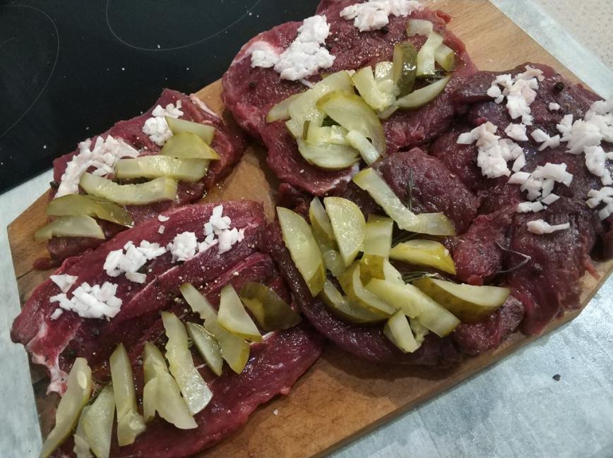 Эх, расскажу, вроде после обеда...))) Лось по особенному. В общем кусок лося разделил на порционные куски, но большие, грамм по 350-500. Вдоль надрезал, посолил, поперчил, положил по чуть розмарина. Далее достал маминых огурчиков, порезал. Свиное сало настрогал из морозилки и мелко порубил (очень важно, т.к. мелкие кусочки практически растворятся, а жирнота мяса останется). Все это уложил на мясо и сложив его пополам закрепил зубочистками. Тушил в пакете, в который добавил две столовых ложки рассола из банки огурцов. Время в пакете - 1 час, с открытым пакетом - 45 минут. На 30 минут оставил потомиться в выключенной духовке. Отличное блюдо для всей семьи, дети кушали на УРА! Всем приятного аппетита!