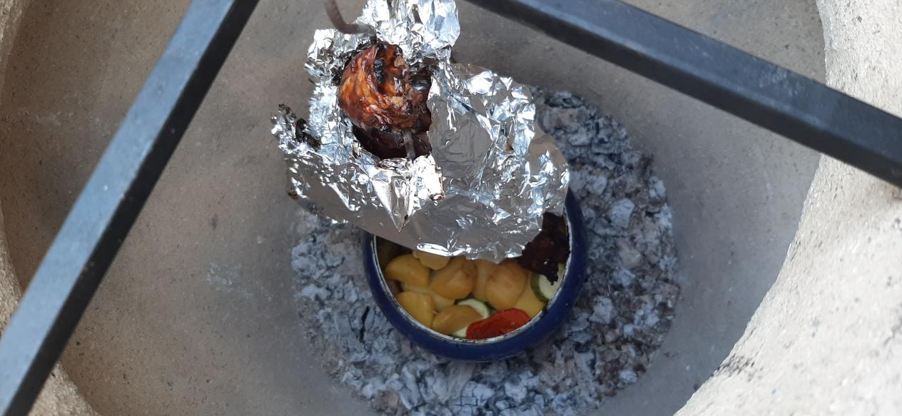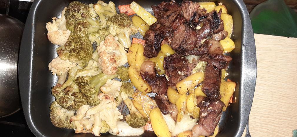Овощи наше все... Брокколи, цветная, картошечка, морковка, лучок, кусочек свининки. Маринуем в соли, масле, специях, чесноке. На протвень, чутка водички, потомили и газку. Подрумянили и на стол! |
