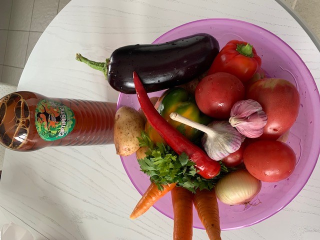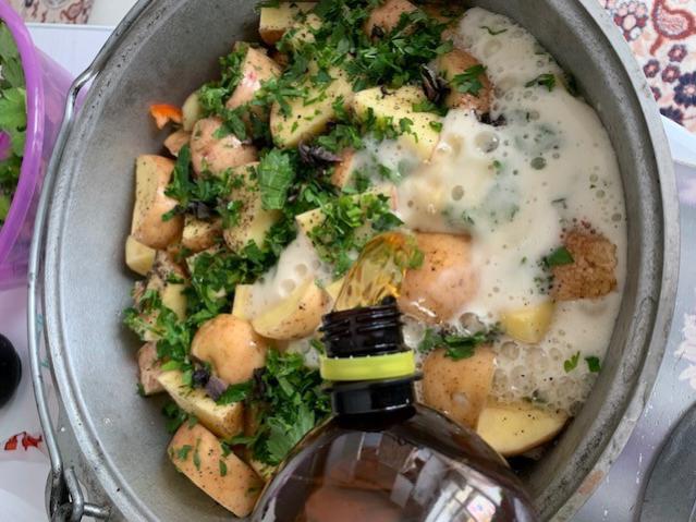 Хашлама! Решил я приготовить Хашламу (честно все руки не доходили). Как раз выдались выходные и мы с друзьями, с семьями у мангала собрались … Как оказалось рецептов Хашламы очень много, как плова или ухи например… Я выбрал простой, ленивый рецепт, просто слои уложил по своему и все…. Вообще готовить Хашламу очень просто, проще любого супа…))) Рецепт: мяса молодого кабаненка на кости (уголки, пистолетики) – 2.5 кг. Укладываем в казан, на дно, солим перчим + лавровый лист, сверху на него лук полукольцами, один стручок острого перца, помидор дольками так же слой, перец сладкий, морковь, сверху картошечку – каждый слой солим и перчим, без «особенных» специй. Сверху зелень: петрушка, укроп, кинза… Залил литром воды и 300 грамм пива (знаю, что в идеале вообще на пиве готовить, но решил как решил…). Закрываем крышкой, доводим до кипения и убавляем жар/огонь. 2 часа томилось это чудо в казанке и после открывания крышки стало одним из моих любимых блюд! Бульон – не передать словами, вкус овощей не описать, мясо – нежное, от косточки отходит, короче не могу рассказать…))), это надо пробовать! Рекомендую всем приготовить! Приятного аппетита!