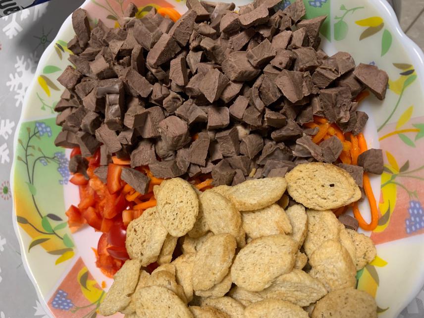 Сердце лося большое, его хватает на несколько готовок нескольких блюд. Так как в конце года добыл лося я, сердце досталось мне! А теперь внимание блюдо из сердца – САЛАТ. 1. Отвариваем сердце – минут 20 после закипания (соль, лук, перчик и лаврушка). 2. Морковь по корейски куплена в магазине. 3. Сухарики и болгарский перец так же. 4. Все шинкуем и заправляем майонезом. Ооооочень вкусно! Подойдет салат как на праздничный стол так и для обычного семейного ужина. Легкий, сочный, вкусный! |