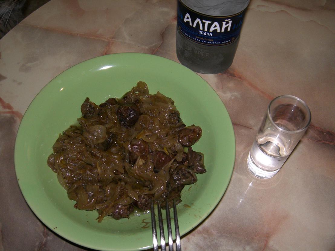 Пока в духовке идет готовка готовлю закуску себе. Потроха от трёх утят с оставшимся рассолом на сковороде начинаем готовить,потом добавляем лук и сальца кабаньего. 20 минут и запахи из духовки не так тебя сильно волнуют)