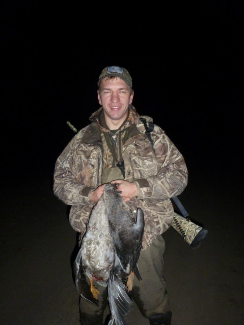Вот белолобик добытый в октябре в прошлом году на болоте в приволжском р-не. Массового пролёта у нас осенью нет, но изредка наблюдал как и одиночек , так и небольшие стаи. Также не раз слышал ночью гогот пролетающих стай. Бакланов тоже наблюдаю, в основном на волге , утром летят в верх по течению, вечером вниз. В биноколь с приличного растояния можно отличить гуся от баклана.
