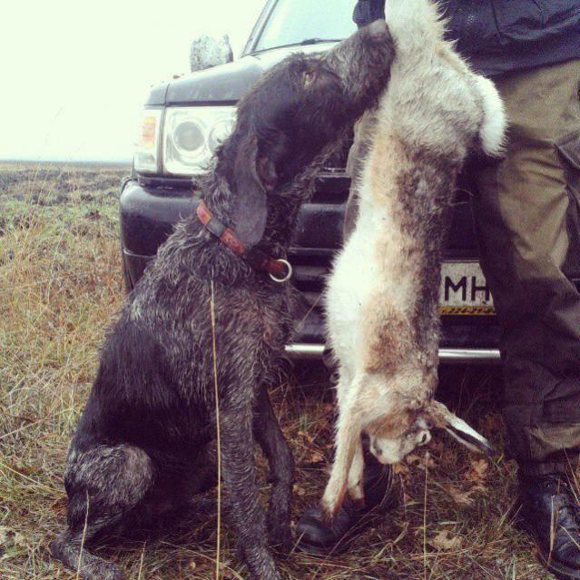 Результат субботы 2 ноября. Моя пока носом работает- молчит и "тянется", а когда уже видит- тоже гонит с голосом. Притом и зайца и козу. Лису мы пока не встречали, не знает она запаха. Поднялся этот заяц в колке от того, что собака рядом кружила, потом тихой сапой мимо меня свалить пытался. Не вышло...
