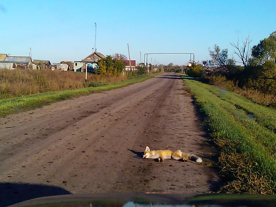 ехав сегодня с утрянки, видел такую картину (бешеные лисы в населенные пункты последнее время часто заходят, об этом слышал уже неоднократно):