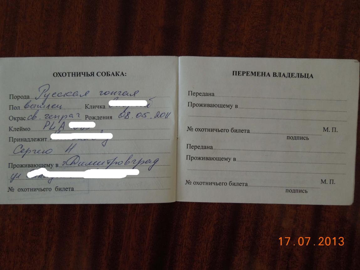 у нас по другому сделали-приходишь в охотобщество с документами на собаку (справка о происхождении) и с ветпаспортом, кинолог выписывает "паспорт", ставит штамп и дату "допущен к охоте".