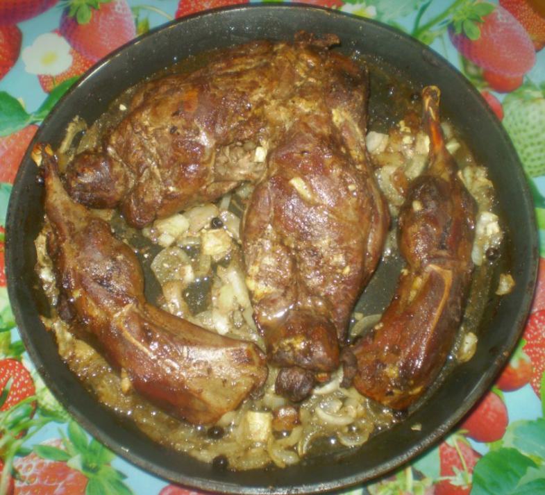На сутки, как полагается вымачиваем Степашку в уксусе в прохладном месте, у меня это лоджия. Разрезаем поперек, (береться только задняя часть) промываем от уксуса, шпигуем долькоами чеснока и кусочками (в размер чеснока) свинного сала. Т. К. мясо у зая суховатое. Натираем солью, перцем и растительным маслом. Масла не стоит жалеть, желательно, что-б оно полностью покрывало дно посуды. Укладываем в подходящую посуду и....... В духовку! Готовиться это блюдо около часа-полутора, в течении готовки следует время от времени вынимать и поливать собравшимся внизу жиром. На любителя, минут за пятнадцать до окончания готовки добавляем порезанный полукольцами лук, перец горошком, ну и специи, кто какие уважает! Все! Готов Степашка! Мне больше всего понравился почему-то под чачу!