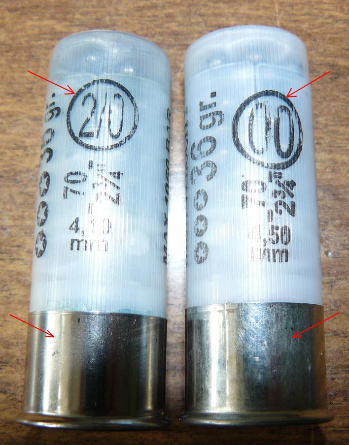 е) надписи на гильзе произведены по разному на одной тонко и четко, на другой жирнее и размазано. На фото патрон с тонкой надписью длительное время был в эксплуатации, а другой новый из пачки.