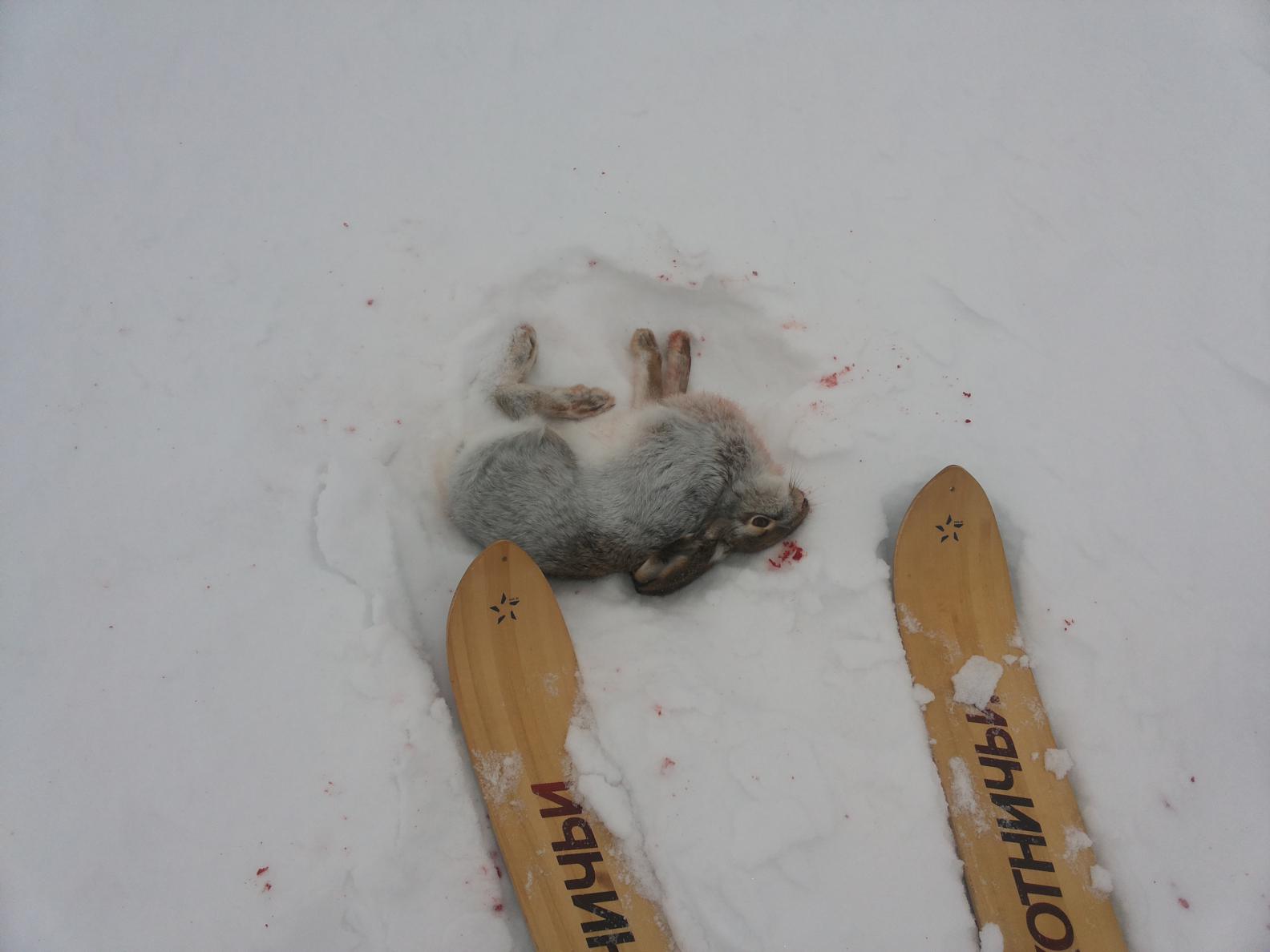На снегу была небольшая корка, следов было полно, но сложно отличить на глаз свежие, приходилось руками проверять степень с которой замерзли льдинки наста поломанные заячьими лапами. Следы были такие: И такие: и даже такие: А так же встречались старые лежки: Часам к 10-ти вокруг стало людно . В округе появилось еще две компании охотников, но - "Кто рано встает, тому -Бог подает!" Мы уже протоптали половину интересных мест (хоть и без результата), а самое интересное как раз топтали, когда на нашей радиоволне появились конкуренты/коллеги. Перекинувшись несколькими фразами -встретились через минут 20 поднявшись на железную дорогу. Посетовали на то что народу-как на Кировском рынке, определились кто куда пойдет и разошлись миром. (Пожелал дядьке "Ни пуха", а он мне в ответ -"Удачи" , я исправился и сказал -"Вам тоже тогда огромной УДАЧИ" Пля, все охотники вроде и все-равно не знают (а может специально?) что УДАЧИ не желают в наших делах.Тут началось самое интересное! Вроде с мужиком решили, что они идут на "зеленку", а я иду в другую строну. И тут в 50-ти метрах за спиной у этого дядьки я нашел интересный следок (он его пропустил). Начал я его смотреть да распутывать. След спускался с "железки" и с высоты я видел "сдвойку", туда и пошел, а мужики, видимо увидев, что я иду по следу, начали ко мне приближаться. Под "железкой" был проход и после трех "сдвоек" след уходил туда, далее на видео: Забыл - минут за 20 до этого, братишка встретил зайца, который тупо пялился на него из лежки. Поглядев друг другу в глаза - чуваки занялись каждый своим делом: заяц сваливать, а брат стрелять. Победил братан! К обеду решили переместиться на другое место, где народу поменьше. Больше пробивались, чем охотились: Но все же нашли хороший, перспективный, но очень ветреный кусочек с оазисом затишья в виде пруда с дамбой и зарослями. Там подняли третьего, Диман стрелял, но далековато было. На голой пашне зацепиться за след не смогли, зай остался на потом, еще приедем к нему в гости. Общий счет 2:1 в нашу пользу. Вот такое зрелище встретил, эко кому-то делать нехер было: Заяц потянул на 3 кг чистым весом. При разделке вытащил 6 дробин, те что прошли через кость стали вот такими: Промыл, залил водой и поставил на балкон. Утром было так :Как сказал один наш форумчанин "Заяц в глазури!" Всем "Ни пуха.......", до новых встреч!!