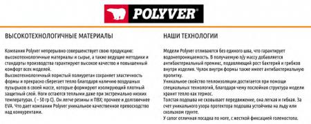 Сапоги Polyver тестировались в экстремально холодных условиях Чукотки, Белого моря (при - 55 градусов Цельсия) и в средней полосе РФ и зарекомендовали себя с лучшей стороны. Вспененный полиуретан является лучшим теплоизолятором за счет пузырьков воздуха в полиуретановой массе. Сапоги отлиты в едином блоке, таким образом нет ни одного клееного шва, что делает их абсолютно водонепроницаемыми. Сапоги Polyver не нуждаются в специальных стельках и вкладышах, чтобы защищать от холода. Отливаемая масса полиуретана смешана с антибактериальной добавкой, которая не позволяет развиваться бактериям и плесени внутри сапога. Они легче своих аналогов из ПВХ и резины на 30%, что позволяет не уставать ногам при длительном хождении, а если их сравнить с аналогами из материала EVA, то они в разы прочнее и долговечнее. Сапоги Polyver используются в течение многих лет.