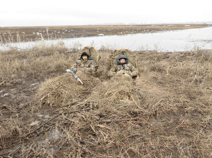 Коврик (непромокаемый) и синтетики костюм лешего (осока) ложимся в прфеля (чучела) и все. Да, наличием складок местности желательно воспользоваться. из 5 налетов- 3 твои. если есть клочки снега задача упрощается наличием зимнего маскхалата. зы. альтернативу яме так и не нашел