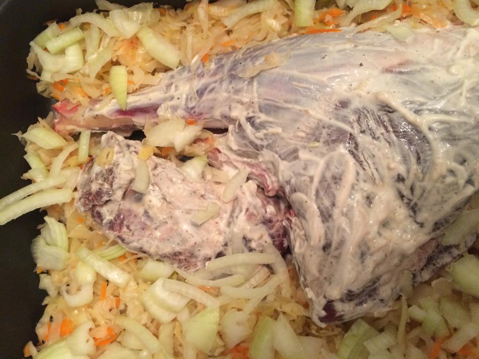 Ногу косули мариную: соль, перец - 3 часа, поливаю сметаной с чесноком (периодически повторяя эту процедуру) - еще пару часов. На противень выкладываю мясо, вокруг выкладываю квашеную капусту, сыплю перцем, добавляю лук, сверху картошку нарезанную (как кто любит), обмазываю оставшейся смесью сметаны с чесноком, солю. Накрываю фольгой и в духовку на 1 - 1,5 часа, перед готовностью за 15 минут "покрывало" убираю. Очень вкусно и сочно, мои очень довольны!!! А молодого хрюшу просто жарю на масле с солью, перцем и луком...