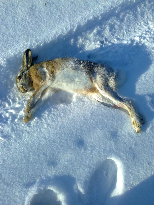 , надо было переместиться ближе к дороге, но не об этом. Погоняли мы косого часа 2 и батя добыл его на краю лесополосы . На часах 14:30, подумали-подумали и решили что пора и честь знать. У меня если честно после вчерашней с C@LMAROM охоты ноги до сих пор гудят. Слышал по радио сегодня ночью метель обещают. На выхи должна быть удачная охота. Всем удачи!!!