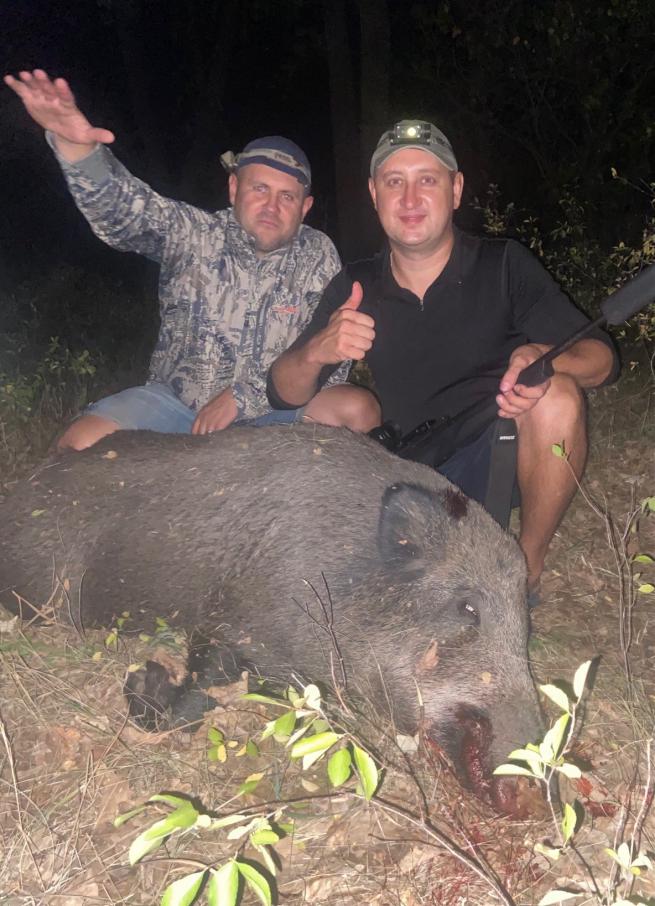 Трава шуршит – пипец, еле двигаемся. Метров 250… Кажется идем уже час, хорошо наш напарник увидел наши маневры и затаился… Уже в сапогах стало чавкать от пота, сами как мыши мокрые. Кабан стоит у болота в траве, видно горб и голову, мордой в пригорок в лес, ветра нет. Да, что ветер – комаров нет (впервые такое), лес, болото и нет комара… Вот жарища! 150 метров, Ваня шепнул: «стреляю». Жаль гляделка не пишет видео, она мерит расстояние, но не пишет видео – ну такие кадры профуканы… Выстрел! Знаменитое «Есть!» Выдыхаем и уже хочется упасть и просто посидеть в водичке, как вдруг кабан начинает движение вверх…. С собой еще один патрон… Мы за ним, уже не таясь понятно. Трясина, я споткнулся упал, грязь, вонь в этой чаче приподнялись на пригорок, кабан мелькнул раз, второй, кабан ранен, судя по движениям прилично, мы замерли… Голова и шея показались на мгновение из кустов еще раз… Тыщщщщ! Слева выстрел Ивана – шлепок!... Вскрытие показало два смертельных ранения по голове мастерски выполненных моим другом.