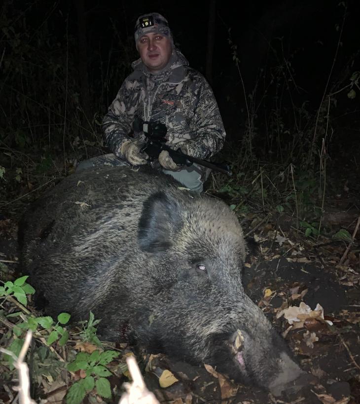 Через 2,5 часа ожиданий решили проехать до другого поля, скошенной семечки и глянуть на обстановку там. Доехав до угла посадки, обволакивающей огромный овраг, пошли тихо ступая вдоль поля, метров 5 прошли как Иван вновь увидел жирующего кабана – он казался очень крупным, в общем наш вариант. Предательски луна сзади нас вышла из-за тучки и кабана, можно приглядевшись уже видеть без прицелов, стало очень светло. «164 метра, Лех» - прошипел мой друг, наблюдавший за процессом через гляделку с дальномером. «Не подойдем, от нас тени от луны, придется стрелять так, сможешь?» Не велика дистанция, но не привычные 100 метров, готовлюсь. Кабан шагает в нашу сторону, прицел на кратность 5,4… Секунды кажутся минутами, часами… И вот он подставил бок… В голове мелькнула мысль – «по лопатке», что б наверняка…