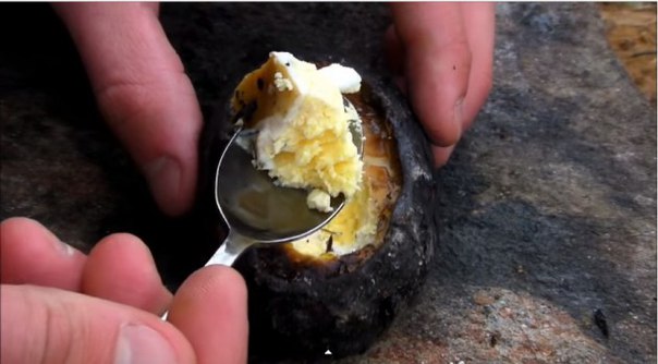 ЯЙЦО В КАРТОФЕЛЕ Картофелина и куриное яйцо. Все готовится в полевых условиях, на костре. Точнее на раскаленных углях. Давайте по порядку: Берем чистую сырую картофелину и срезаем вдоль нее краешек. Далее берем ложку и при помощи нее, вырезаем сердцевину картофелины. Теперь самое интересное: берем яйцо, разбиваем и выливаем в картофелину. Затем, очередь крышечки. Берем спички и втыкаем в нее. Ну вот: готово. Берем наше «блюдо» и ставим на угли. Ждем около 20 минут. Блюдо приготовилось. Можно подавать на стол. Осторожно срезаем крышечку ножом. Вуаля! Приятного аппетита! |