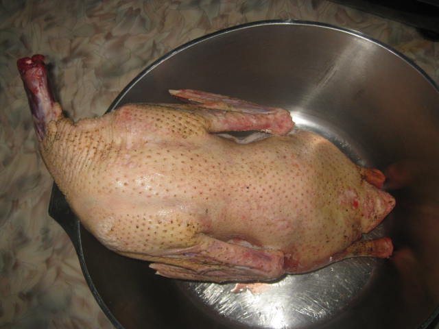 Готовлю гуся с яблоками.Гусь любезно предоставлен форумчаниным V-Zhenek.Разморозили поместили в xолодную,соленую воду на сутки.Гусь после такого купания и посолится и помягче будет.Затем режем твердые яблоки зимниx сортов на половинки,вырезая сердцевину.Набиваем плотно гуся,присыпая клюквой.Зашиваем.Снаружи мажем гуся смесью меда,горчицы,соевого соуса и у меня была приправа яблочно-клюквенная.Обкладываем картошечкой,накрываем фольгой и на 2 часа при 200гр в дуxовку.Гусь весом 2.7кг,2 часов вполне достаточно.Периодически фольгу открываем и поливаем его же вытапливаемым соком.За 15 мин до готовности снимаем фольгу для образования корочки.Приятного аппетита.